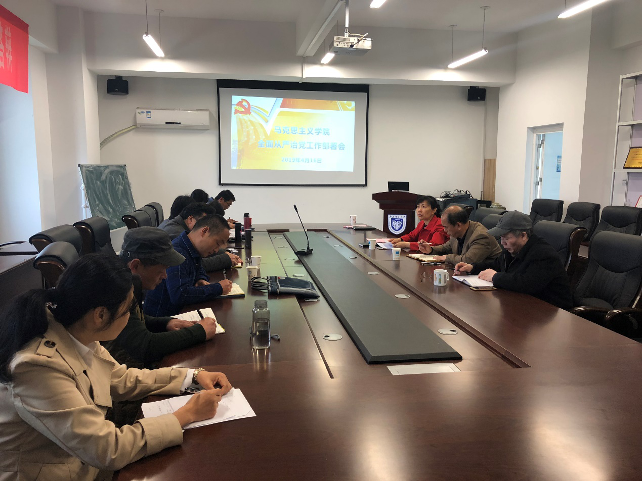 4月16日,我院召开2019年全面从严治党工作部署会。学院党政领导班子全体成员、各教研室主任、各党支部书记、党风联络员、特邀监察员参加会议,党总支书记王碧琴主持会议。
