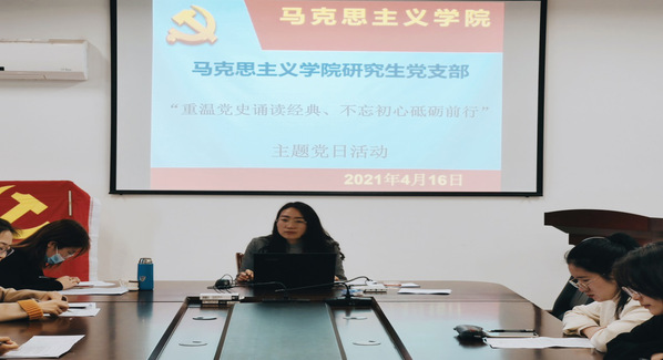 为庆祝中国共产党成立100周年,深入推进党史学习教育,传承红色基因和革命精神,4月16日下午,我院研究生党支部在文科楼330会议室开展了“重温党史诵读经典、不忘初心命砥砺前行”主题党日活动,活动由马克思主义学院研究生党支部书记刘凤娟老师主持。
