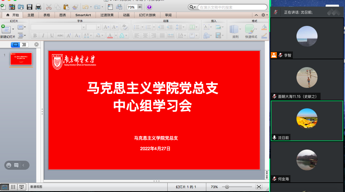 根据学习计划,4月27日下午,马克思主义学院党总支理论学习中心组召开专题学习会,学习习近平总书记在海南考察调研时的重要讲话精神。会议由党总支书记沈召前主持,德法教研室党支部书记李咏梅和纲要教研室党支部书记李凤成作重点发言,理论学习中心组其他成员进行交流研讨。本次理论学习中心组学习会以线上学习方式进行。