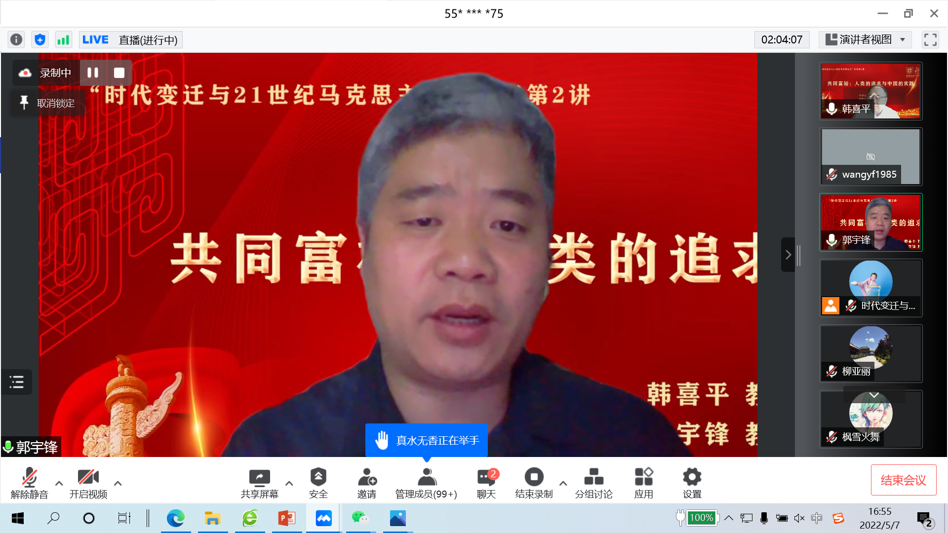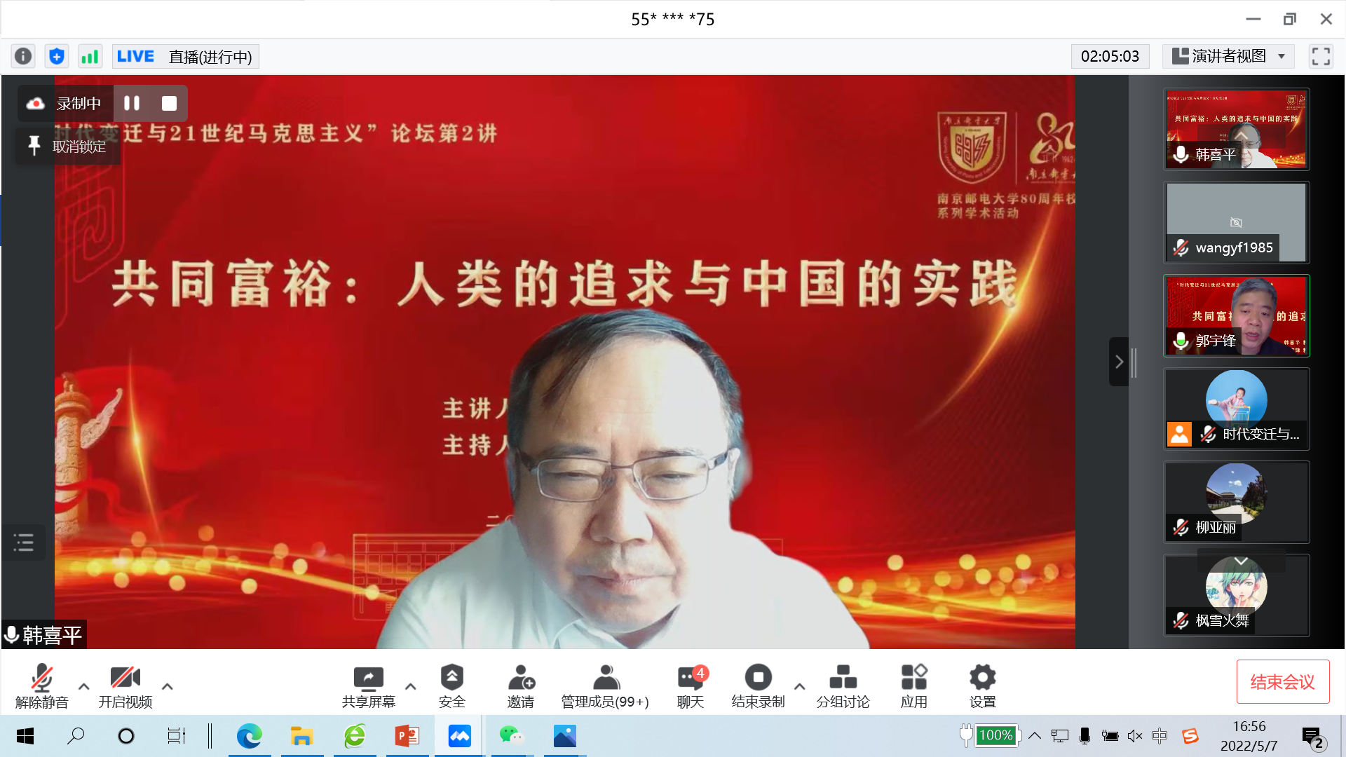 5月7日,吉林大学党委副书记、教授、博士生导师韩喜平应邀作题为“共同富裕:人类的追求与中国的实践”的在线学术报告。校党委常委、副校长郭宇锋主持论坛,马克思主义学院相关负责人、师生代表以及兄弟院校的部分学者240余人参加论坛。本次报告为“时代变迁与21世纪马克思主义”系列论坛第二讲。
