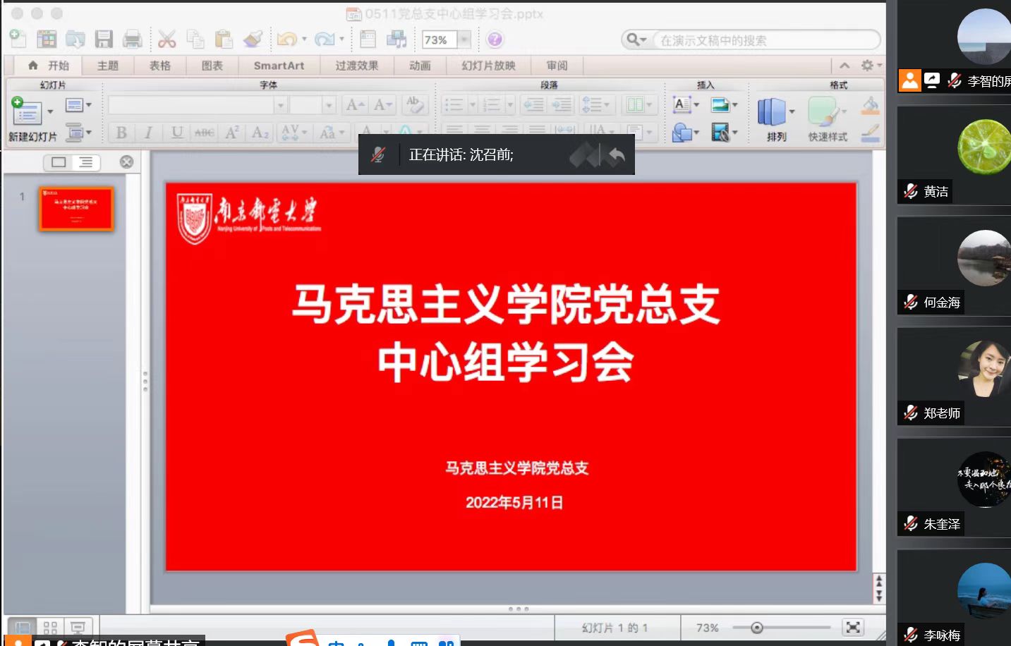 根据学习计划,5月11日下午,马克思主义学院党总支理论学习中心组召开专题学习会,学习贯彻落实5月5日中共中央政治局常务委员会会议精神。会议由党总支书记沈召前主持,党总支副书记、副院长朱奎泽和研究生党支部书记黄洁作重点发言,理论学习中心组其他成员进行交流研讨。本次学习会以线上学习方式进行。
