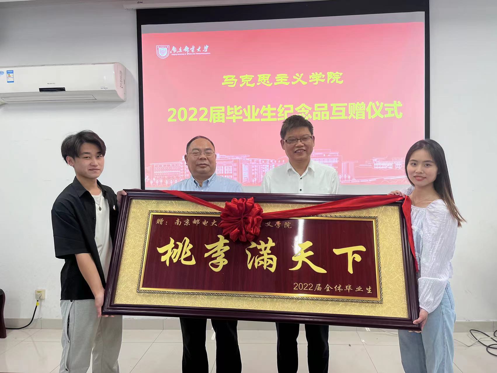 毕业生代表向学院敬赠了题为“桃李满天下”的牌匾,感谢三年来学院的辛勤培养和老师们的辛勤教导。祝愿马克思主义学院桃李满天下,春晖遍四野。