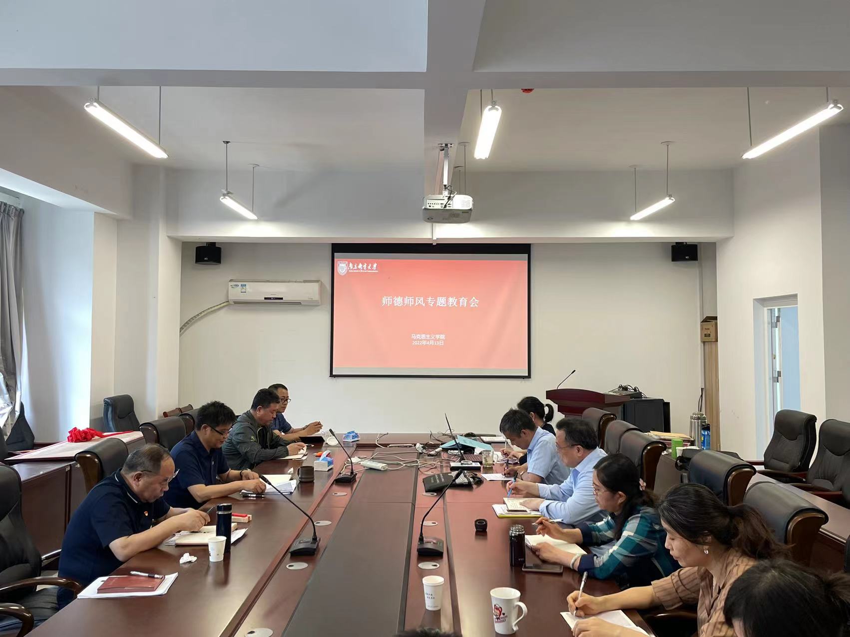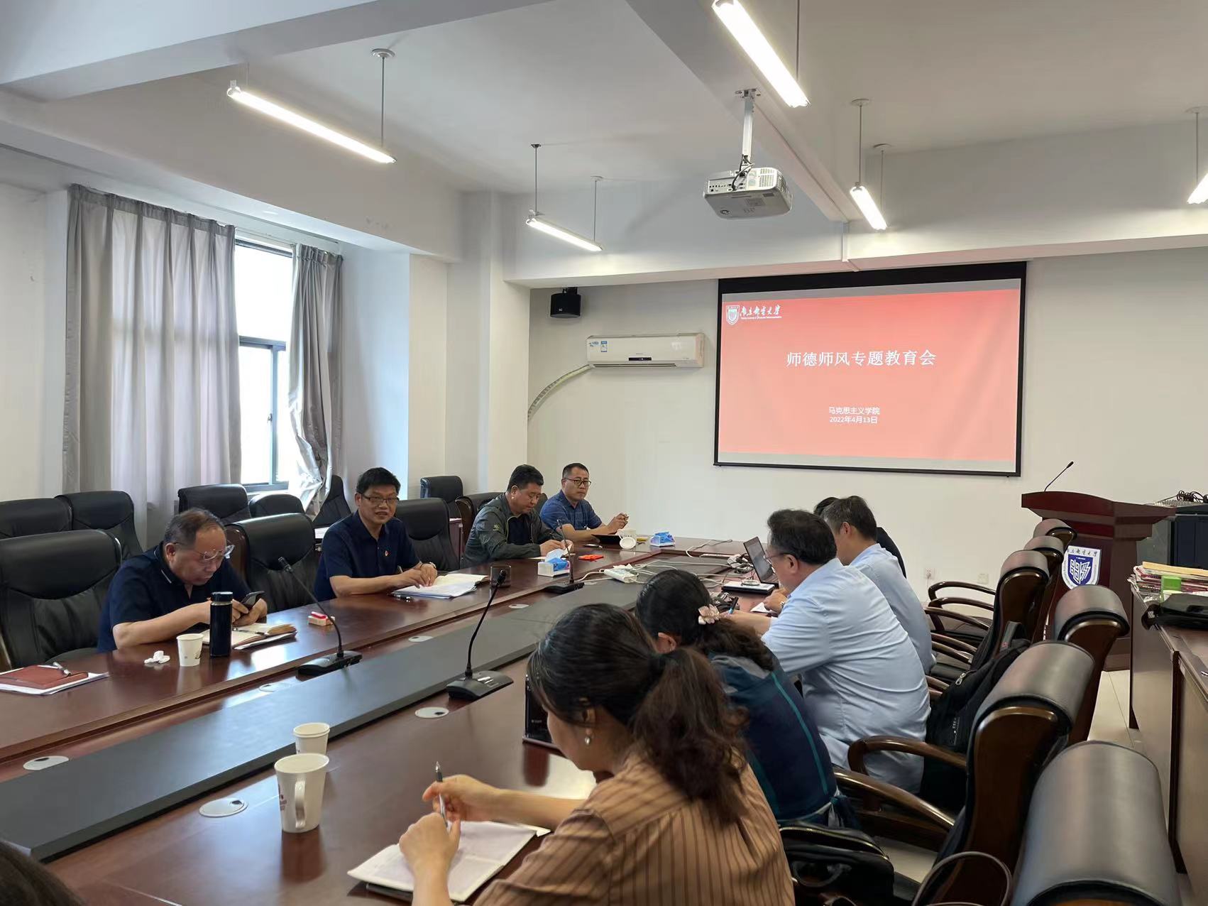 4月13日下午,我院在文科楼330会议室召开师德师风专题教育会,会议以线上线下相结合形式进行。学院党总支书记沈召前主持会议,全体班子成员、办公室行政人员、各支部书记、各教研室主任线下参加,其余教职工线上参会。