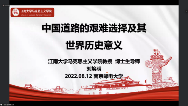 8月12日下午,江南大学马克思主义学院教授刘焕明以《中国道路的艰难选择及其世界历史意义》为题,从中国道路的艰难选择、中国道路的科学内涵、中国道路的世界历史意义三个方面,指出中国道路是创造人民美好生活、实现中华民族伟大复兴的康壮大道。坚定不移走中国特色社会主义道路,党和人民就具有无比广阔的舞台,具有无比深厚的历史底蕴,具有无比强大的前进定力。