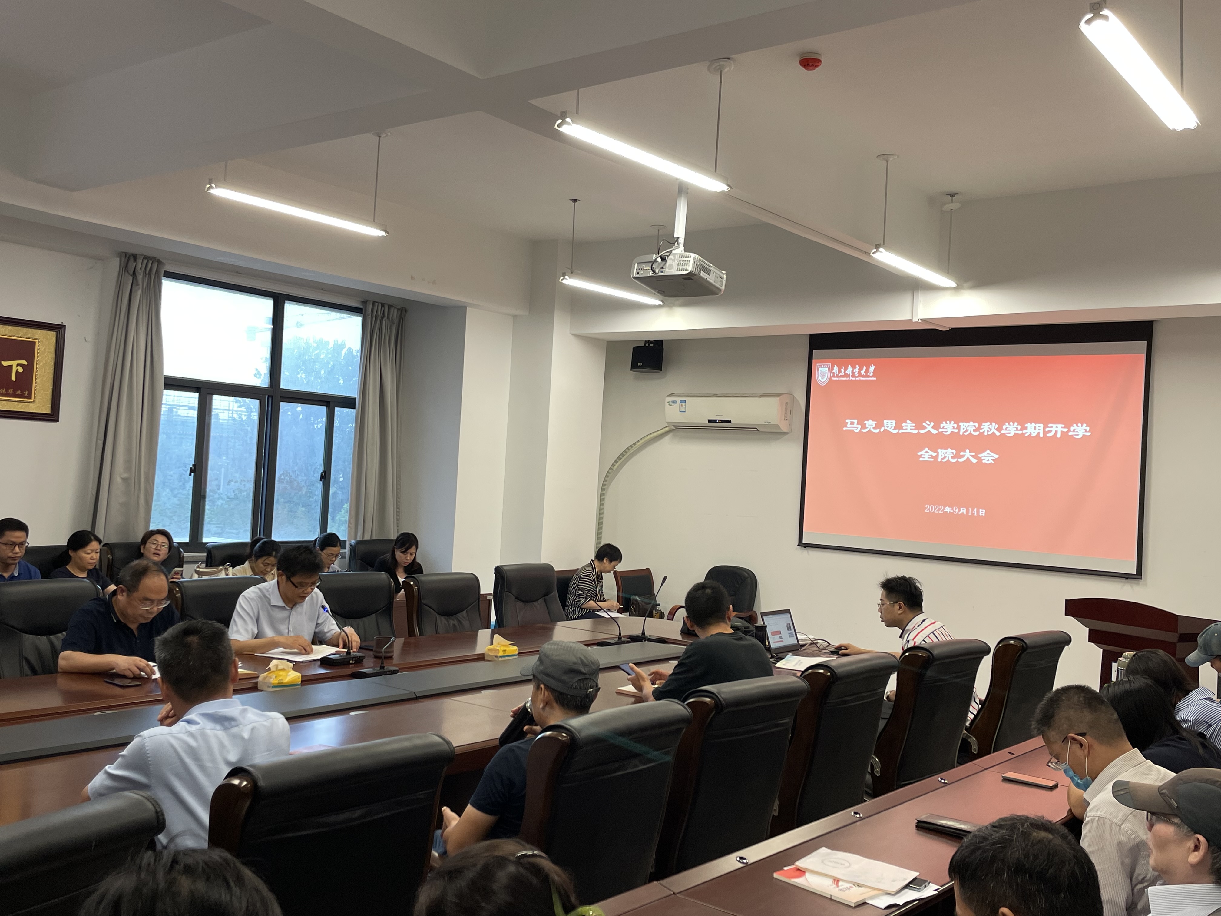 汪院长全面回顾了学院今年以来开展的主要工作,并就本学期重点工作进行部署。他指出,学院坚决贯彻习近平总书记关于思政课系列重要讲话精神、“七一”讲话精神、党的十九届六中全会精神和中办《关于加强新时代马克思主义学院建设的意见》、教育部《高等学校思想政治理论课建设标准(2021年本)》等最新重要讲话和文件精神,严格按照校党委、行政的要求和党委常委会思政课专题会议的精神,持续用力、扎实工作,在党建、师资队伍建设、思政课教学、学科建设等方面取得了良好成绩。本学期要围绕全年目标任务,对标对表,以党建和思想政治工作为引领,以学科建设为龙头,以思政课建设为首要,坚持内涵式发展道路,全面提升学院综合实力和社会声誉。一是以迎接、学习贯彻党的二十大精神为引领,全面抓好党建和思想政治工作。重点做好党的二十大精神“三进”、专题研究阐释、校内外宣传宣讲和巡察整改各项任务;二是推动师资队伍建设,加大人才引进力度,强化师资培训体系构建和能力提升体系构建;三是提高思政课教学质量,各教研室活动要突出教研交流和教研室文化建设两个重点,积极组织开展多样化的实践教学,建好用好实践教学基地,加快推进思政课与信息技术的深度融合;四是做好学科与科研工作,尽快制定校级名师工作室建设计划、科研成果奖励办法,办好“时代变迁与21世纪马克思主义”学术论坛;五是提升研究生培养质量,强化导师责任意识,强化学位论文选题审查以及各个环节的全过程管理,加大研究生教育教学改革力度,强化研究生科研能力训练;六是加强学院内部管理,强化教研室和实践教学中心规范化建设,强化制度落实和执行力。