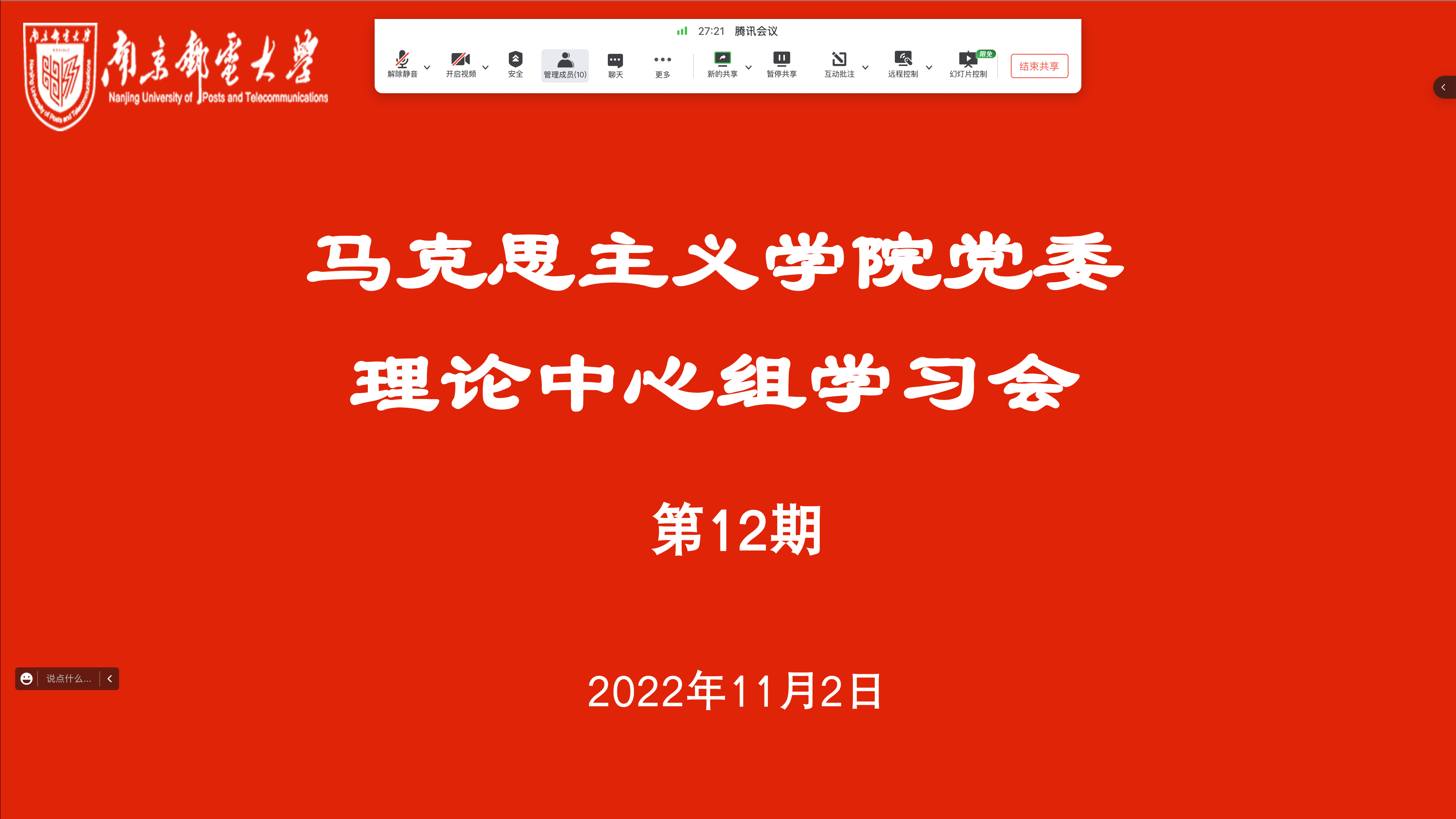 11月2日下午,我院党委理论学习中心组召开专题学习会,学习习近平同志在中国共产党第二十次全国代表大会上的报告。会议由学院党委书记沈召前主持,党委副书记、副院长朱奎泽,党委委员、原理教研室党支部书记何金海作重点发言,理论学习中心组其他成员进行交流研讨。会议以线上形式进行。