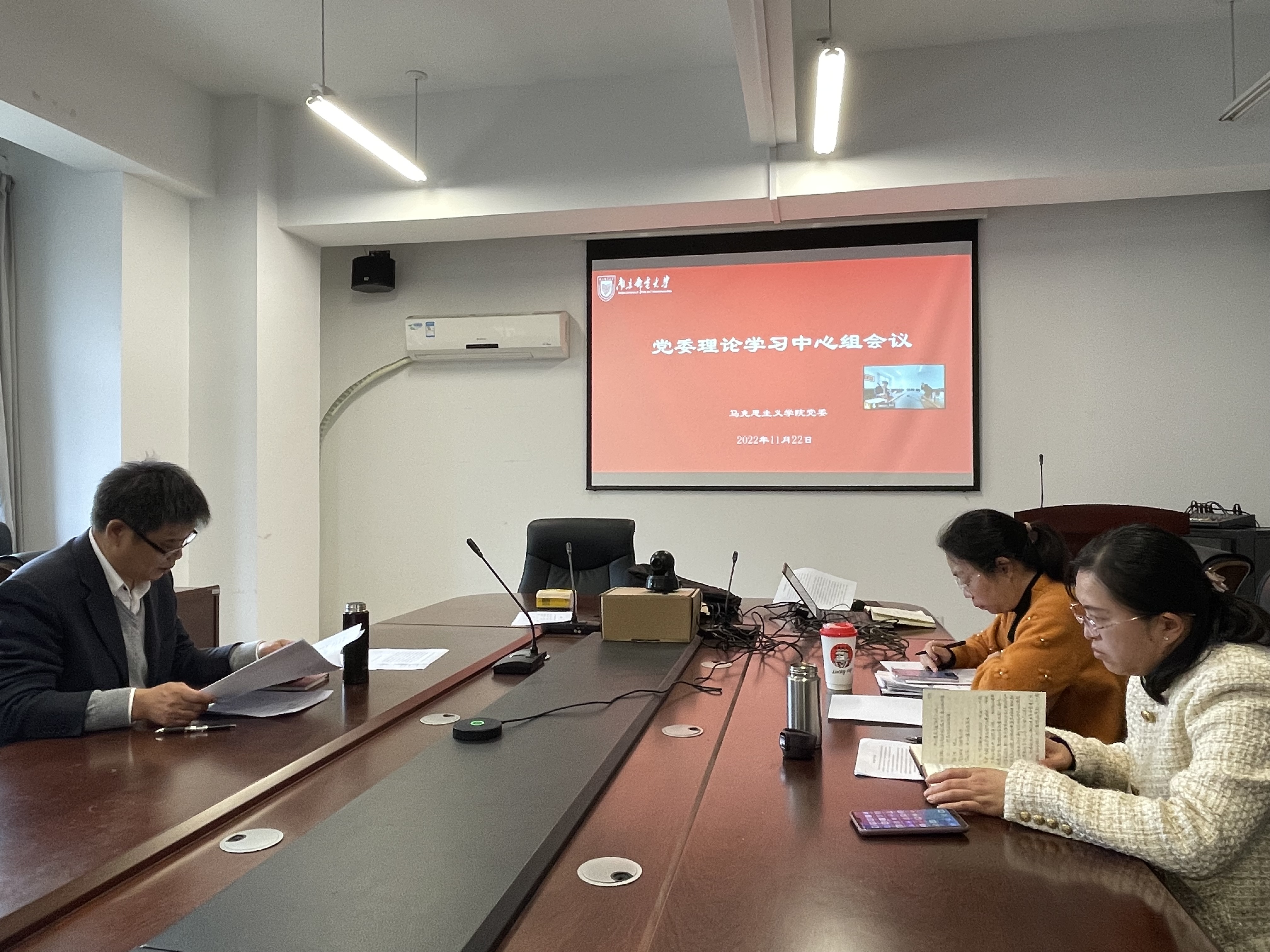 11月23日下午,我院党委理论学习中心组在文科楼330会议室召开专题学习会,学习《中国共产党章程(修正案)》。会议由学院党委书记沈召前主持,德法教研室党支部书记李咏梅,纲要教研室党支部书记李凤成作重点发言,理论学习中心组其他成员进行交流研讨。会议以线上线下结合的形式进行。