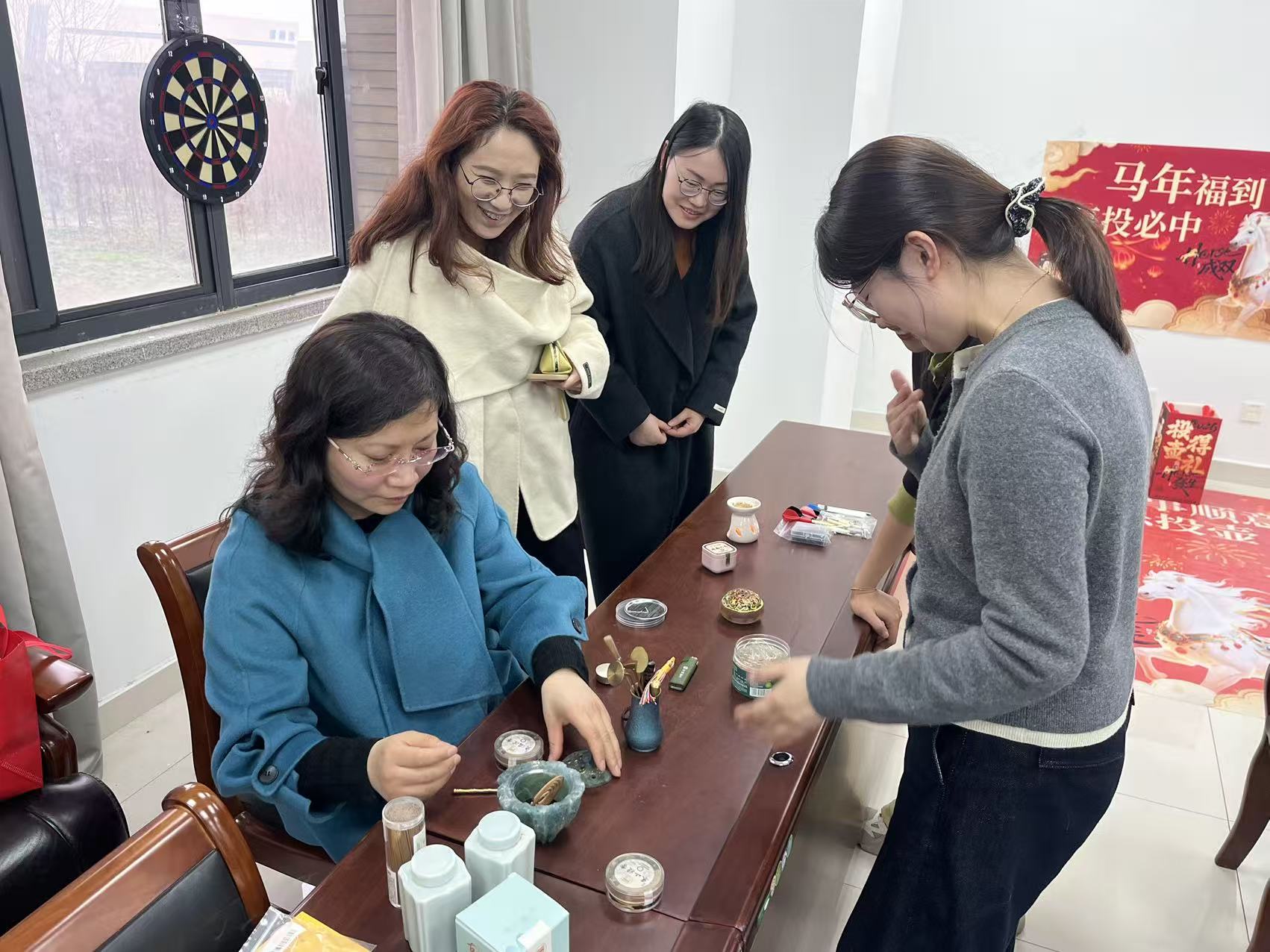 “悦·游艺”环节将现场氛围推向高潮,投壶、飞镖互动区欢笑与喝彩声此起彼伏。品香体验中,工会女工委员严小青精心准备了多种天然香材,大家围坐分辨香材独特气息,交流感受,沉浸式享受香气带来的宁静与美好,充分展现出马院女教师昂扬向上、活力满满的精神风貌。