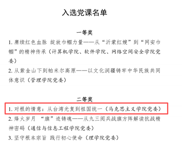 近日,校党委公布了“铸魂育人青春向党”党课评选活动结果,我院党委选送的张家维老师主讲的《对根的情意:从台湾光复到祖国统一》经过激烈角逐,荣获二等奖。这是我院党建在创新党员教育形式、提升党课质量方面取得的又一成果,充分体现了我院党建与思政工作深度融合的扎实成效。