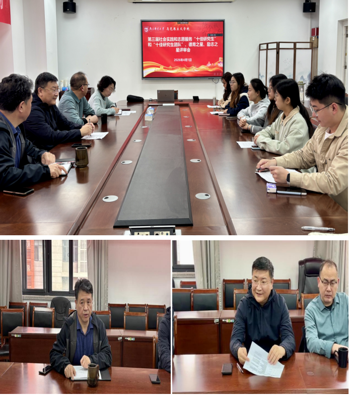 4 月 1 日上午,学院在文科楼330会议室召开社会实践和志愿服务“十佳研究生”“十佳研究生团队”及德育之星、励志之星评审会。会议由学院副书记、副院长朱奎泽主持,学院书记李大伟、研究生导师代表张宇、研究生辅导员黄洁出席会议。此次评审会旨在深入落实立德树人根本任务,充分发挥先进典型示范引领作用,激励广大研究生坚定理想信念、锤炼品德修为、勇于担当奉献。