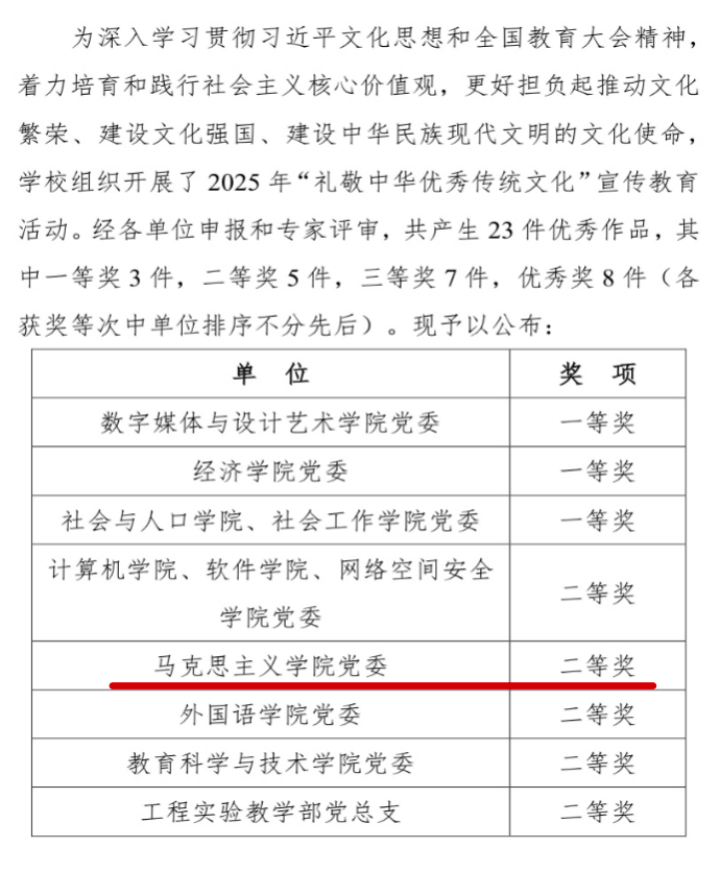 最终,作品荣获“礼敬中华优秀传统文化”宣传教育活动校级二等奖。这一成绩不仅是对我院师生深入挖掘红色资源、创新思政教育形式的充分肯定,更彰显了我院在新时代文化育人中的使命与担当。学院将持续深化“大思政课”建设,推动中华优秀传统文化融入思想政治教育全过程,引导青年学子在赓续中华文脉、红色血脉中汲取精神力量,在坚定文化自信中展现青春作为,担负起推动文化繁荣、建设文化强国、建设中华民族现代文明的青春使命!